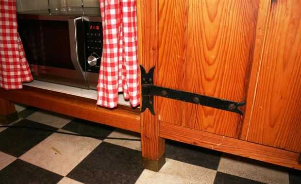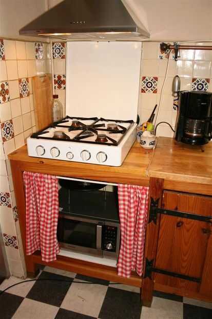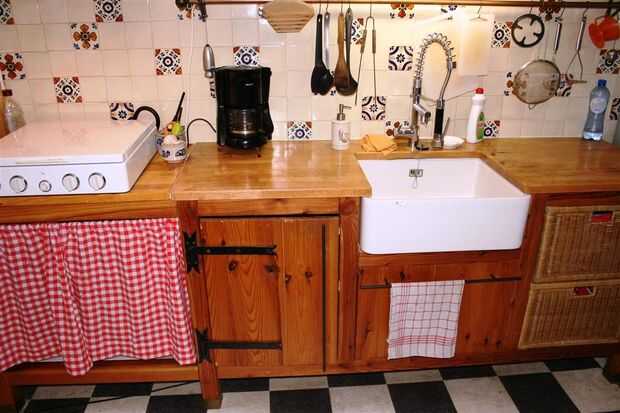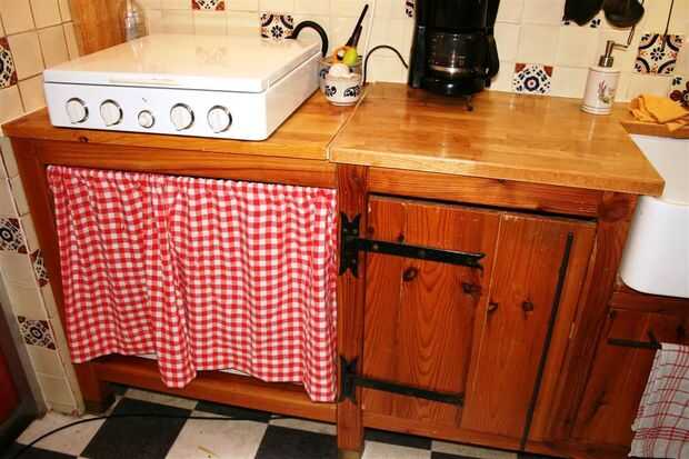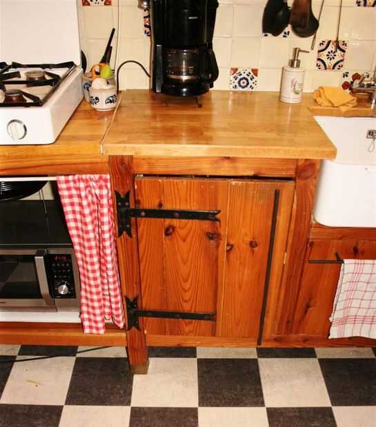 Para unos cinco años la mayor parte de la izquierda con las cortinas, cocina de gas y microondas no estaba allí. Teníamos una nevera pequeña que la olla estaba parado. Más tarde, compró una nevera grande y microondas otro así que tuve que alargar el contador y la parte superior. La madera es estándar y se puede comprar barata en las tiendas de mejoras para el hogar aquí y tenía un pedazo de tapa de tabla de pino que usé para la tapa del trabajo.