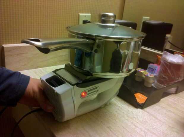 Coloque la plancha boca abajo, hacia arriba del elemento de calefacción. colocar la olla encima de la plancha y encontrar lo que funciona mejor para apuntalar el programa de instalación. Si usted no puede apuntalarlo, simplemente mantenerla. O ir a pedir unos huevos $12 de tu catálogo de servicio de habitaciones.