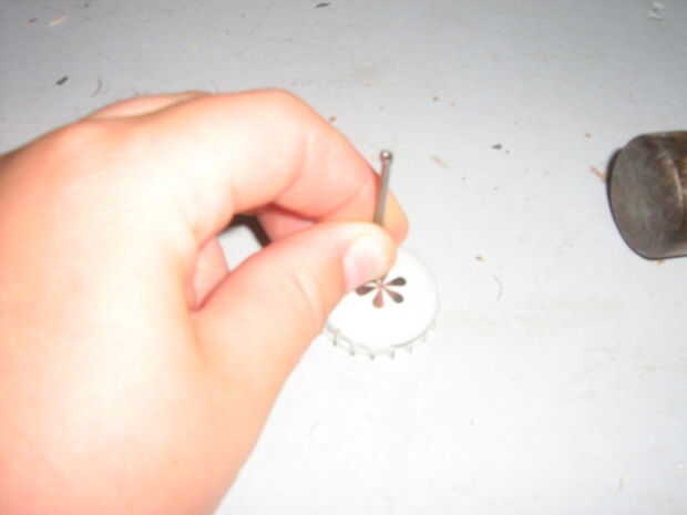 Martillo el clavo en la otra botella tapa sobre cuatro veces el crear los orificios de llenado.