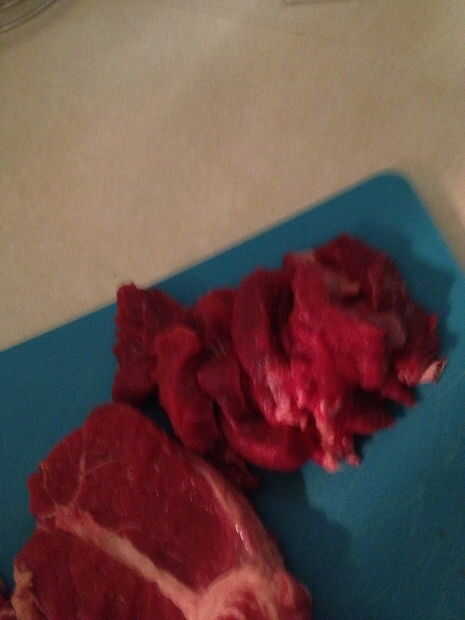 Cortar la carne de res o de pollo en tiras pequeñas.  Si usas pechuga de pollo que va a aplanar hasta que es 1/2 pulgada pensemos.
