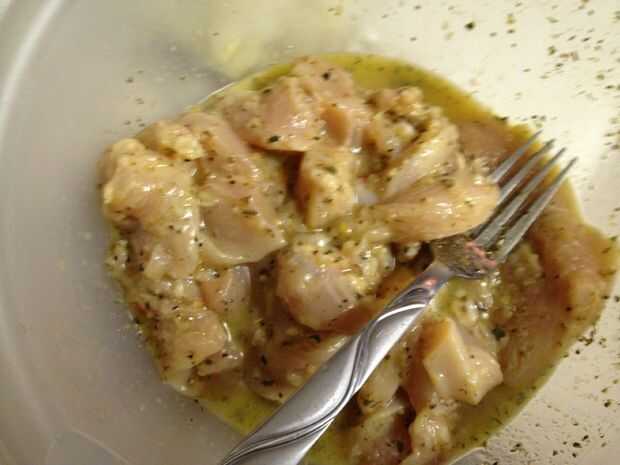 Coloque el pollo, ternera o mezcla de ambos en el recipiente grande con la marinada.  Revuelva la carne hasta que la carne marinada que la cubre.  Luego coloque el recipiente en el refrigerador para adobo.  Se recomienda que la carne es marinada durante 30 minutos, pero puede ser marinada ya.