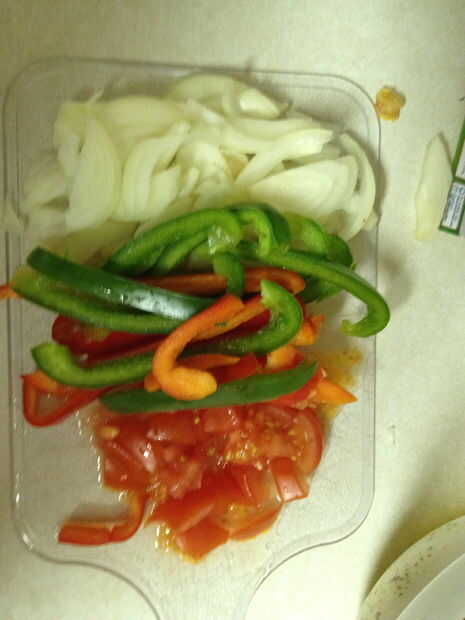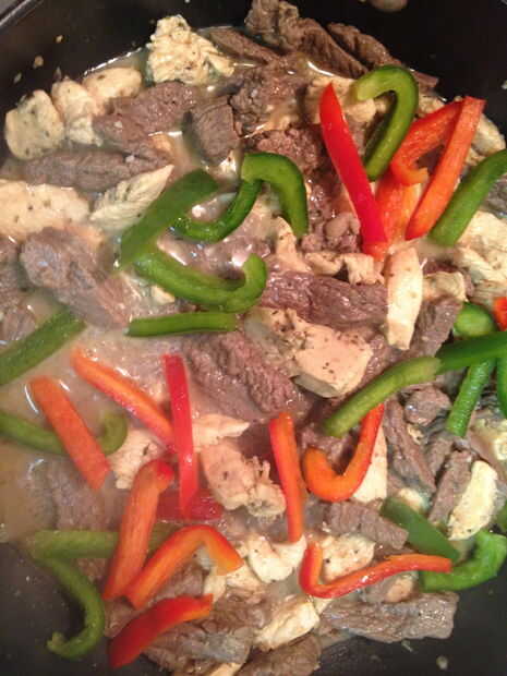 Después de que la carne se cocina completamente añadimos las tiras de pimientos, cebollas y otros desea verduras, así como el resto de la mezcla de la marinada.  Mezclar con la carne hasta que se mezclan bien.  Tapa la cacerola y dejar cocinar hasta que las verduras se cocinan a su ternura deseada.  Para las verduras que sólo están ligeramente crujientes tarda aproximadamente 6-8 minutos.
