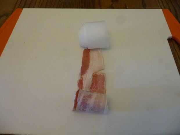 2) Pack de rodillo: Use tiras de papel de pergamino y rodillo el tocino (Nota: no rodar demasiado fuerte el centro).