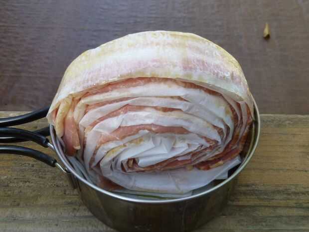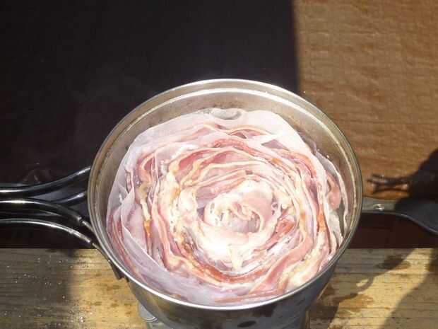 Nota: Si está disponible, agregar algún aceite o mantequilla en el fondo de la olla y cubra los lados del paquete de tocino. Esto evitará que el papel queme hasta que la grasa comienza a procesar.