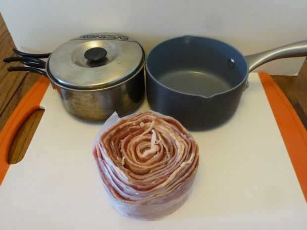 Utilizar una maceta ligeramente más grande que el paquete de tocino. Si un lado de la manada parece tener más grasa, colocarla hacia abajo en el bote. Como hace que la grasa, el nivel de aceite aumentará y cocinar el paquete de tocino, por lo que no quiere una maceta demasiado grande.