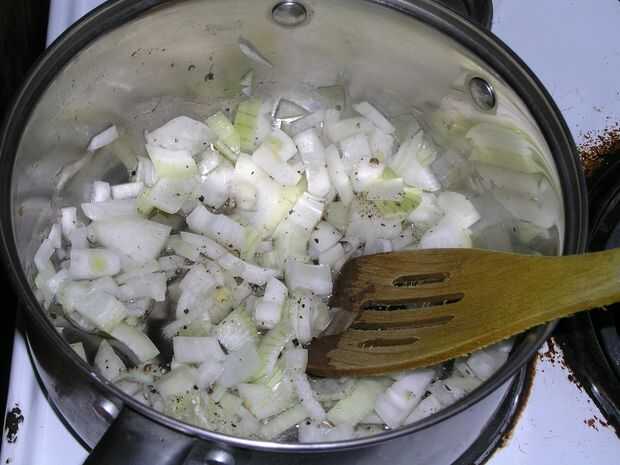 -empezar por freír algunas cebollas a fuego medio (plena potencia) hasta que empiezan a ir transparente. Si usted escucha, usted notará que hay un punto donde el sonido cambia cuando toda el agua de la cebolla ha sido eliminado y el calor va directamente a cocinar las cebollas, que es sobre la hora de empezar a añadir más ingredientes.