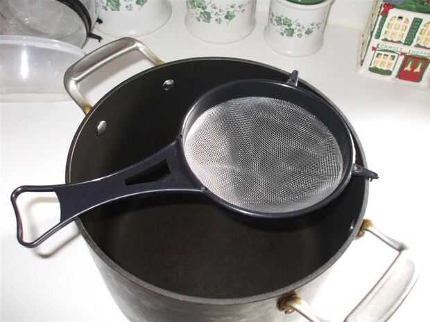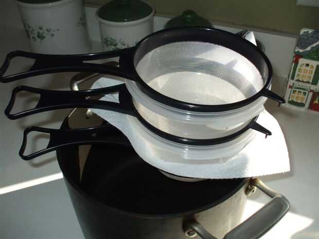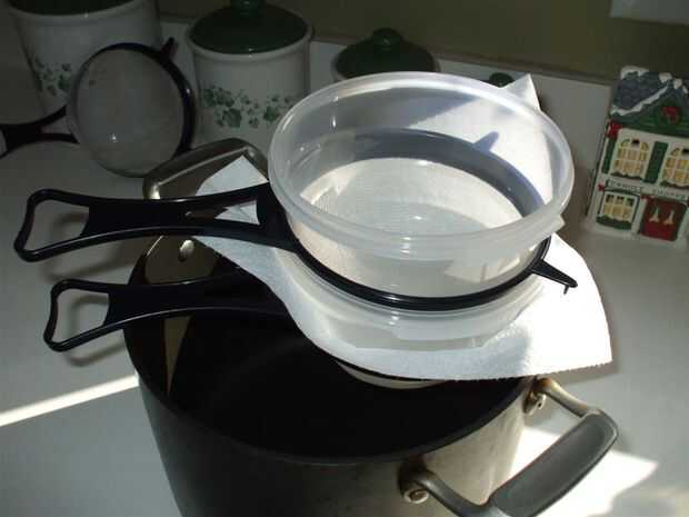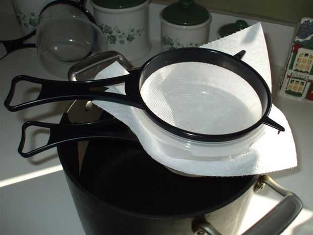 2) descansar un colador encima de la cuenca y la línea con un paño de queso o toalla de papel. Prefiero toallas de papel, porque no tengo ni idea donde encontrar paño de queso y encontrar su basura cuando he terminado de todos modos, al igual que las toallas de papel práctico.