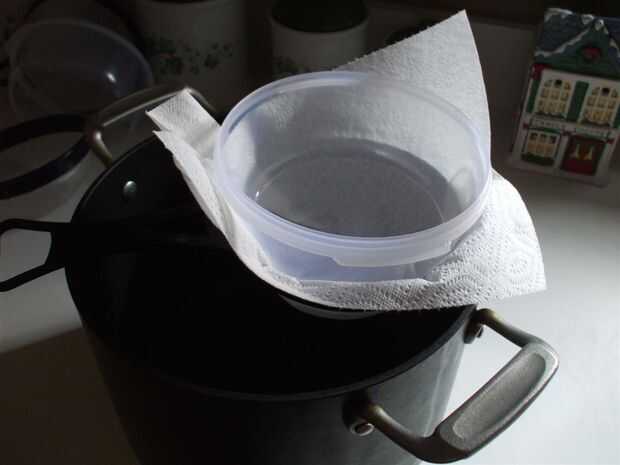 3) empuje el papel de la toalla hacia abajo se ajustan a la forma del recipiente del filtro y añadir a un espaciador de contenedor en la parte superior.