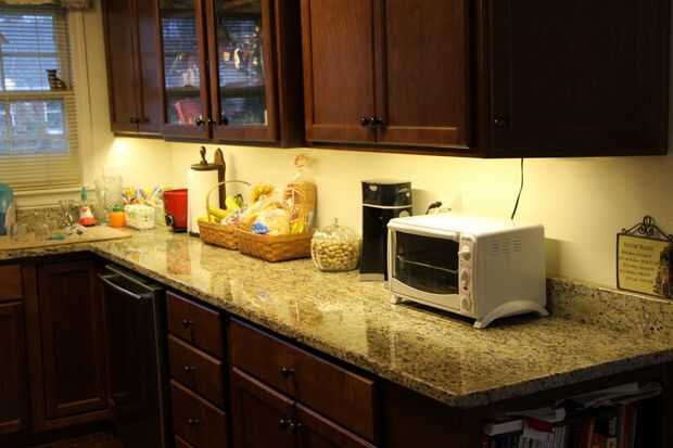 Una cosa buena acerca de estos es sólo son 12 VDC y puede manejarlos sin riesgo de ser sorprendido mientras utilizas una fuente de alimentación totalmente aislado. Si las luces tienden a tirar de los gabinetes puede incluso utilizar pegamento caliente para volver a unir!