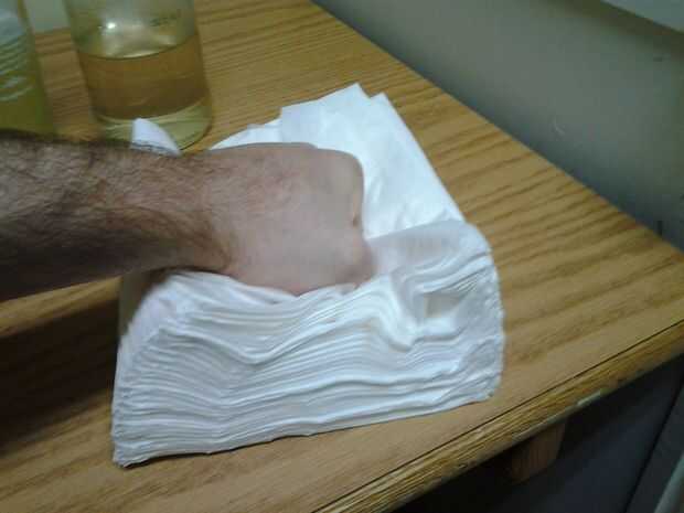 2) hacer su mano izquierda en un puño y pulsar abajo en la parte superior de la servilleta como se muestra en la imagen siguiente.