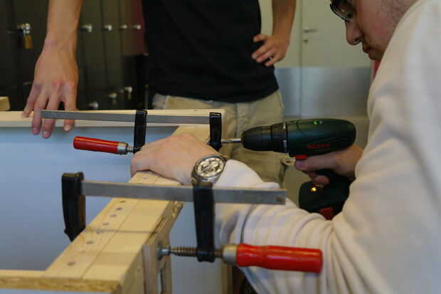 Taladre los orificios para los pernos usando un taladrar previamente para tus mechas de 8mm del centro. Hacer shure puede perforar desde la parte visible o pinza el orificio de salida a otra viga. Si bien no fijan una viga de madera en los agujeros de salida se astilla la madera.
