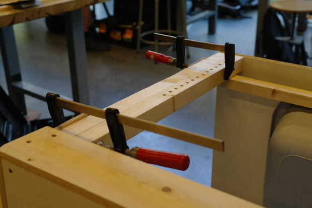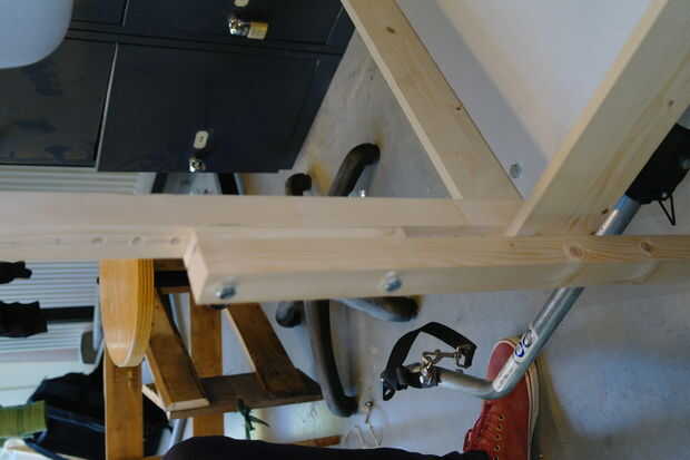 Lugar una de las tablas más pequeñas al ras contra la parte superior de una viga. Ahora sostenga esto contra su carrito y comprobar si donde quieres poner los tornillos. Marca shure tomar una distancia fácilmente divisible entre ambos. Marque abajo "doblado posición lejos" de los tornillos en la viga.