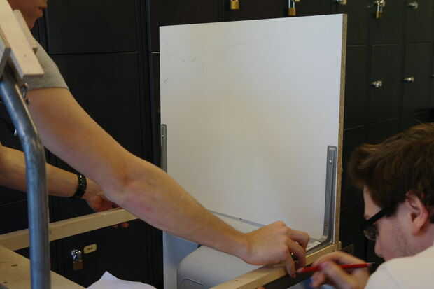 Pídale a un amigo a recoger el hierro L y posición contra las vigas, marcado por los agujeros en el tablero extenstion.