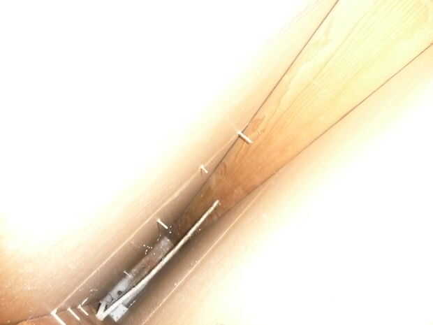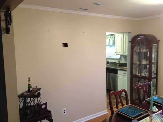 Así en un esfuerzo para planificar tanto como sea posible y no alertar a la mujer, que corte un pequeño agujero el yeso para obtener una buena visión del interior sin su darse cuenta (que tenía una gran pintura sobre él). Así fue por un mes-astuto astuto! Del agujero, pude ver la toma a continuación en ambos lados, así como los alambres para el interruptor de la luz en el lado de la cocina. Ninguna tubería o ventilación estuvo presente. También era capaz de medir hasta la placa superior de adentro, otra vez para verificar que la pared no carga (placa superior solo significa generalmente no carga). tablero del cemento de los años 60 yeso era genial también!