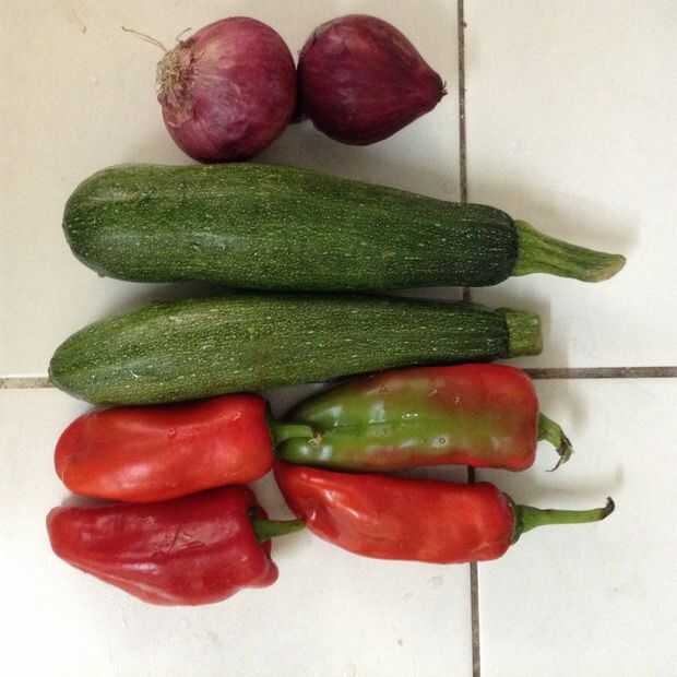 Lavar las verduras y pelar la cebolla. Quitar las semillas de los pimientos y cortarlos en tiras de ancho. Cortar cada calabacín en tres pedazos y corte cada pedazo en cuatro gajos. Cortar las cebollas en rodajas también.
