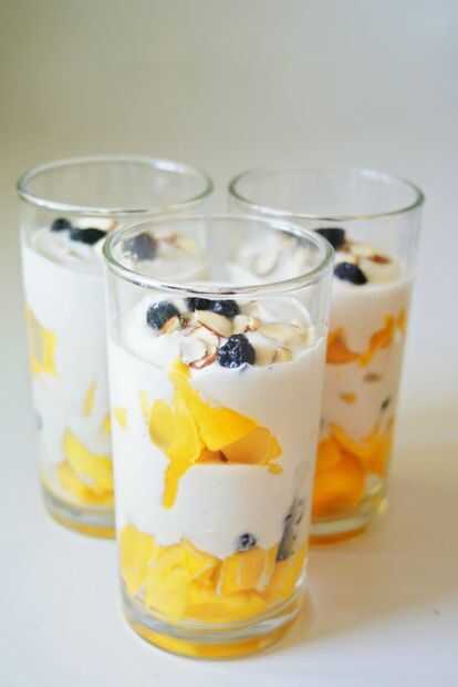 Para hacer los parfaits, en primer lugar, agregue la crema hasta suave. Entonces, la capa los ingredientes de cuatro vasos de la porción como sigue: mango, unos arándanos, crema, una pizca de almendras, mango, unos arándanos, crema, una pizca de almendras y unos arándanos.