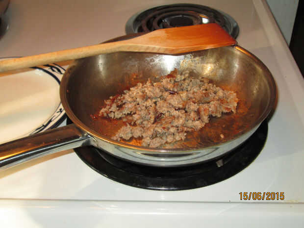 Cocinar la salchicha, desmoronando mientras se cocinan. Y mientras cocina,