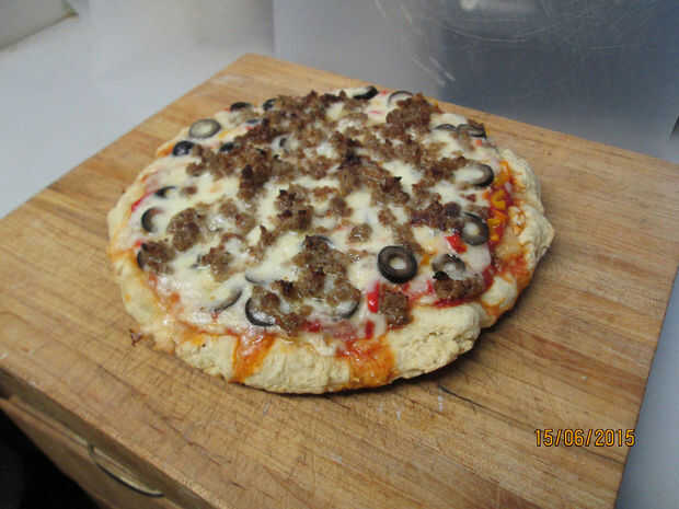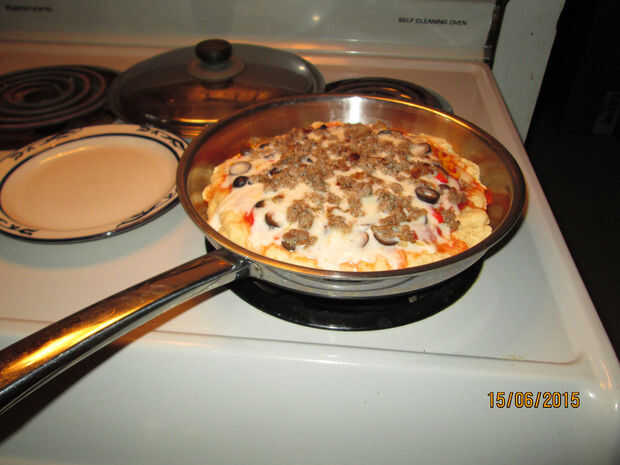 Si desea un efecto algo dorado, precalentar el horno a 450 f el. mientras que la pizza es la estufa de cocina para los últimos 5 minutos. Entonces, cuando la pizza está acabado, Uso agarraderas y quite la tapa del sartén, poner la sartén en el horno durante 3-5 minutos. Cuando se toma hacia fuera, otra vez Uso las agarraderas. Déjelo enfriar en la sartén durante 5 minutos. Luego ejecutar una espátula alrededor de los lados, del pan y trabajar su camino bajo la pizza 1/3 de la manera. Coge la sartén Con agarraderas y sacudir la sartén para ver si la pizza afloja el resto del camino. Si no, suelta más con la espátula. Deslice la pizza de la sartén sobre una placa de hojaldre y cortar en 4 trozos y servir.