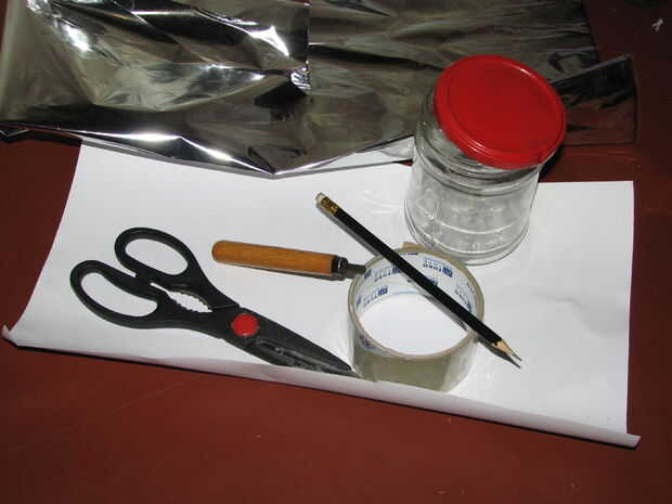 Materiales y herramientas 1 hoja de dibujo papel (Tamaño A0), una cortina de ventana (como material reflectante), 1 tarro cristal con una metálica tornillo tapa (0, 5 L), poder de cerveza 1 aluminio (0, 33 L), 1 tapón dispensador bottle(5L), 2 tramos de cinta, cinta adhesiva, pintura negra (preferiblemente plana) necesita algunas herramientas: tijeras, un cutter (para trabajo del metal), un pincel (si no utilizas un spray).