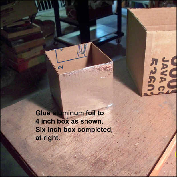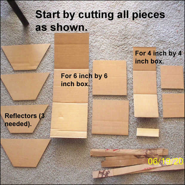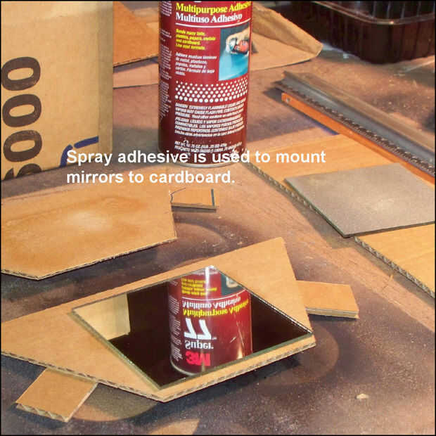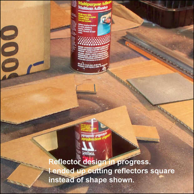 Terminé con reflectores cuadrados, con espejos (pulgadas 4 azulejos del espejo) pegados en con adhesivo en aerosol. Los reflectores se sujetan por un pedazo de cartón ligero pegado en la espalda, y entonces esta pieza se inserta abajo en espacios entre las láminas de aislante de cartón.