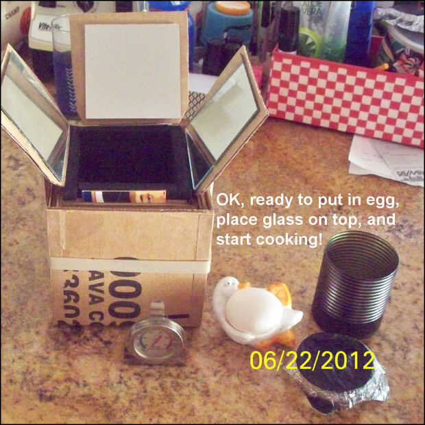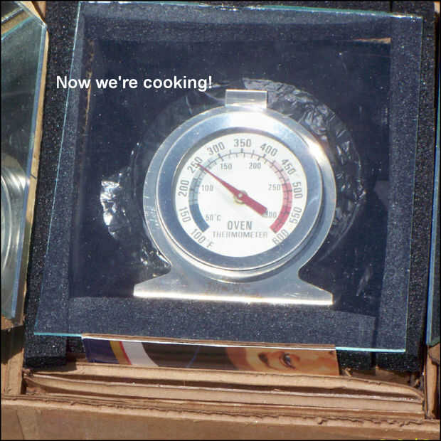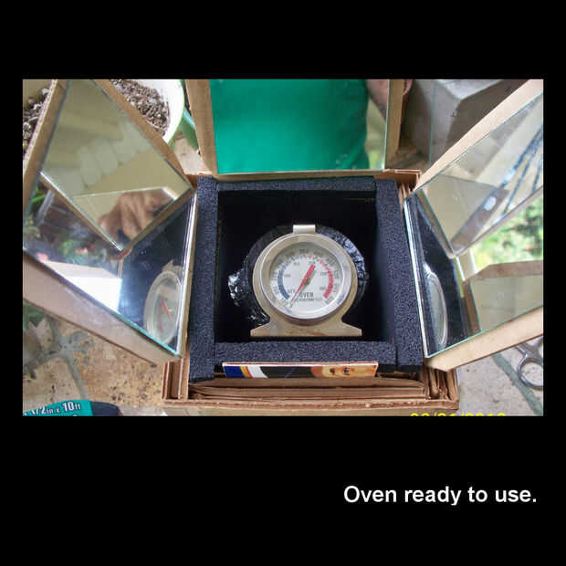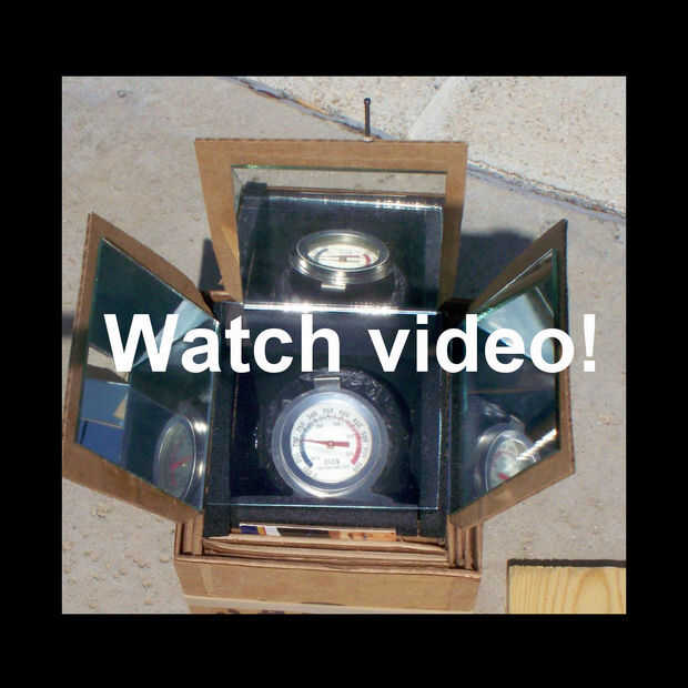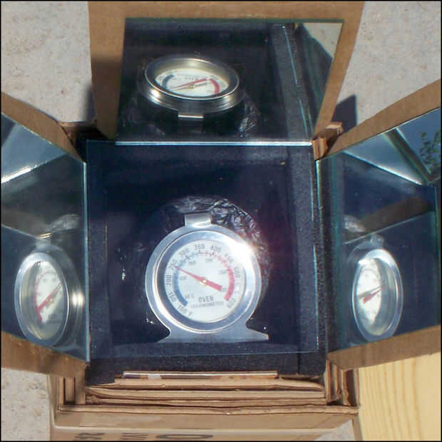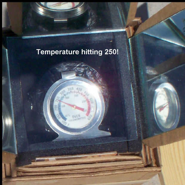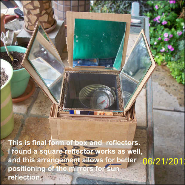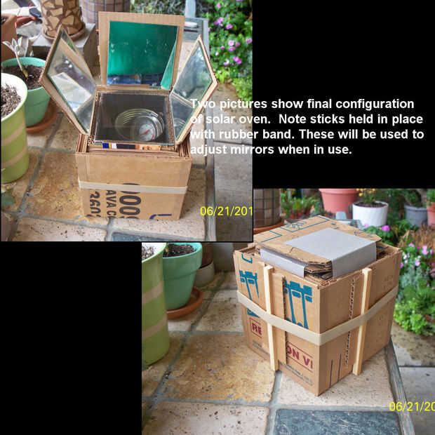 Los reflectores son un sistema muy pasivo y sólo es necesario ajustar un poco. Para ello, he añadido la madera piezas como se muestra, sujeta con una goma pesada. Al ajustar los espejos, aprendes a mirar las sombras de las cajas y la luz del sol reflejada real en la cámara de cocción. Materia de prueba y error.
