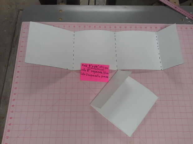 Clip 2 piezas 22 "× 28" cartulina juntos. Cortar 2 cuadrados de 14 "× 14" a través de ambas hojas, dejando dos tiras de 8 "× 28". Doblar las tiras de 8 "× 28" en 2 8 independiente "cuadrados. Pegamento plazas plano para hacer una pieza de base interna y una pieza de base externa.