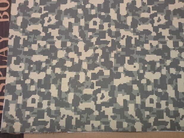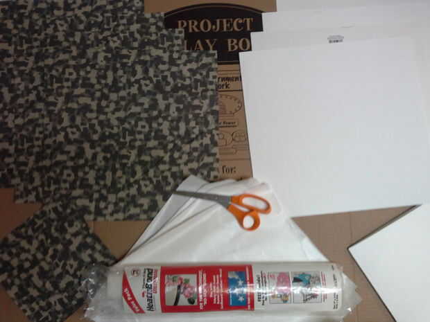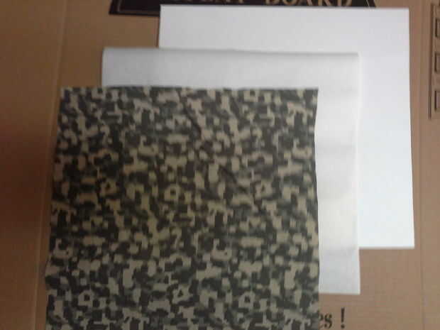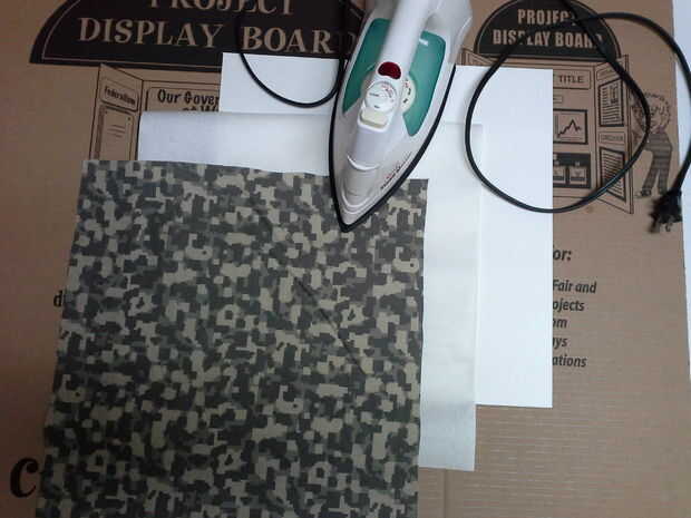 Material de camuflaje cortado en 4 cuadrados 14 "× 14" y 1 cuadrado de 8 "x 8. Corte HeatnBond fusable los mismos tamaños de las correas. Siguiendo las indicaciones del paquete de fusibles material de camuflaje en cartulina del mismo tamaño.