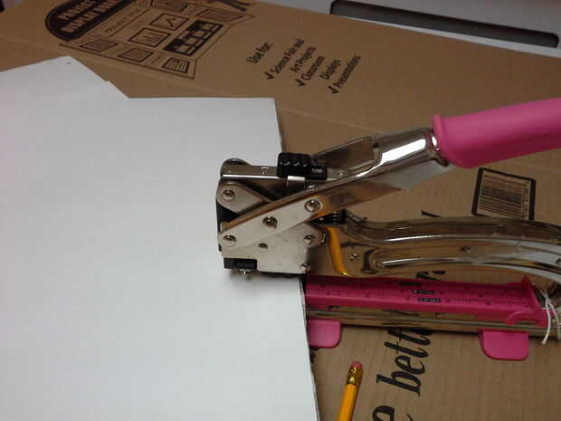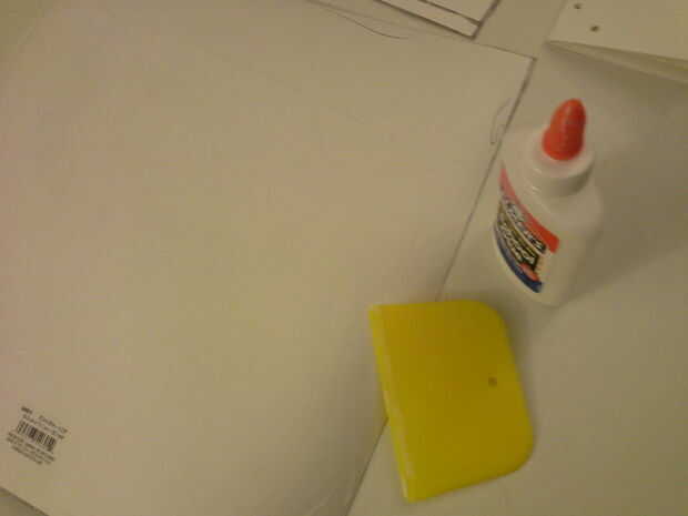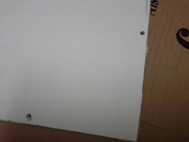 Mida 4" desde la esquina de la 14" x 14" paneles y 3\8" filo, sólo 2 agujeros en una esquina. Mide 1" de la esquina de plazas 8" × 8" y 3/8" del borde y 2 agujeros en las 4 esquinas. Luego use raspador para suavizar el pegamento en el lado del papel de cada panel y aplique papel de aluminio o Mylar.