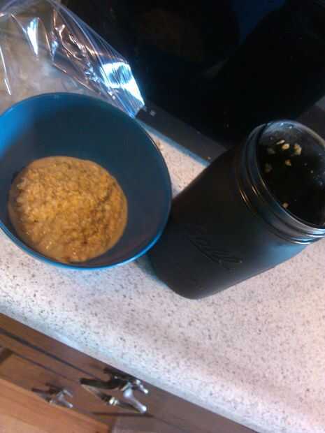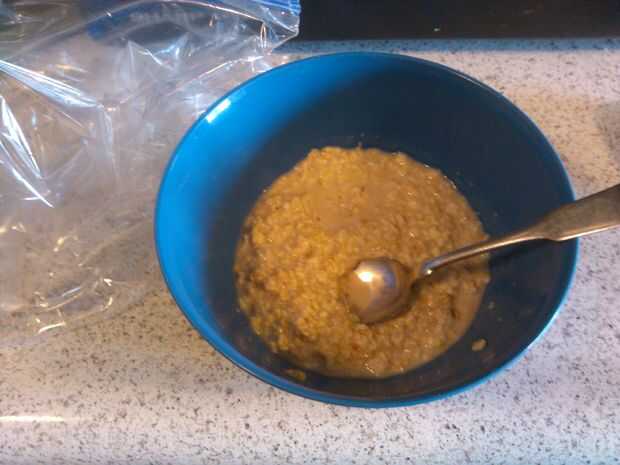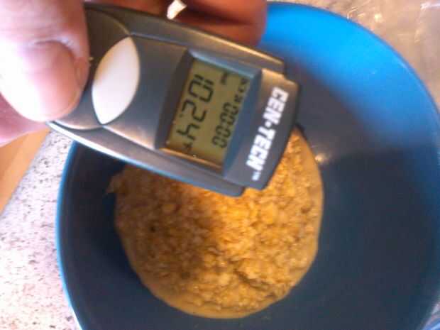 La temperatura externa de tarros cocina fue 120.1F como sacó de la bolsa ziploc, y la temperatura interna era 112F cuando abrió después de la cocción. La temperatura final fue 102F cuando estaba en el bol con una cuchara.