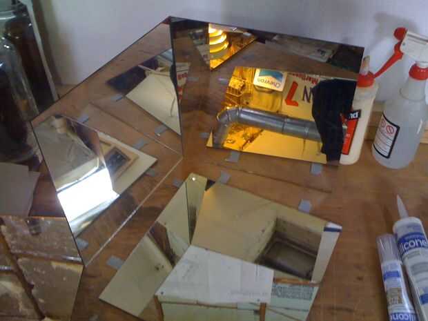 En primer lugar, montar espejos de tres pies cuadrados como se muestra. Usted puede poner con cinta, sin embargo, es muy importante que pongas un buen respaldo en su conjunto para darle fuerza y para reducir las posibilidades de los espejos de romper si se va a llevar y caer. Algo así como correr con tijeras, no hacemos eso. Siempre tenga precaución. También me gustaría sellar con silicona para ayudar a mantener juntos. Esta configuración de los espejos funciona muy bien y es tan sencilla de construir. La olla pone hacia fuera cerca de 80 vatios por mis cálculos, y los espejos sólo va a costar unos 6 dólares por unidad, o $12 2 cocinas.