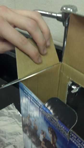De frente y parte superior de la caja cortar una aleta. Deje un pequeño espacio entre la tapa y los lados de la caja. Cortar las aletas del lado de la caja.