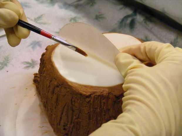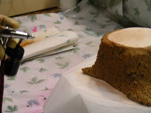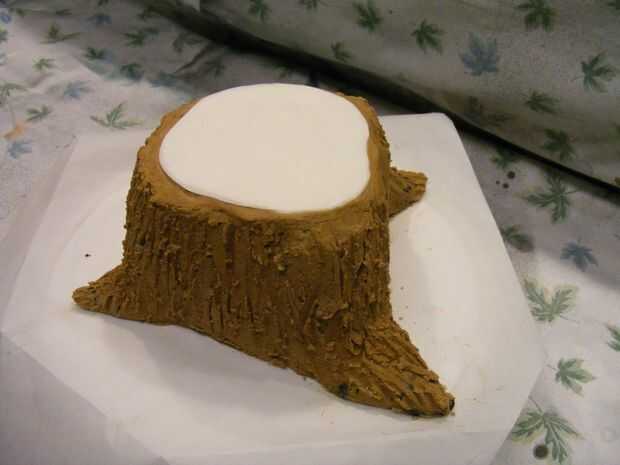 Usé ese trozo de papel como patrón y recorta donde había trazado. Luego rodó algunos (fondant) blanco y cortado por el patrón. A continuación, apliqué lo que ahora debía ser la "parte cortada" del tronco y lo colocó en la crema de mantequilla glaseado, alisando lo y empujando hacia abajo en el hielo. Quiero señalar que sólo podría cubrir todo el árbol con pasta de azúcar, tallar las marcas de la corteza en el fondant luego cepillo de aire. Pero estuve probando los efectos de un uso de una crema de mantequilla costra. La pieza superior del fondant es necesaria de cualquier manera, porque de lo contrario, el fondant hacer-sería demasiado pesado y habría hundido en el tronco.