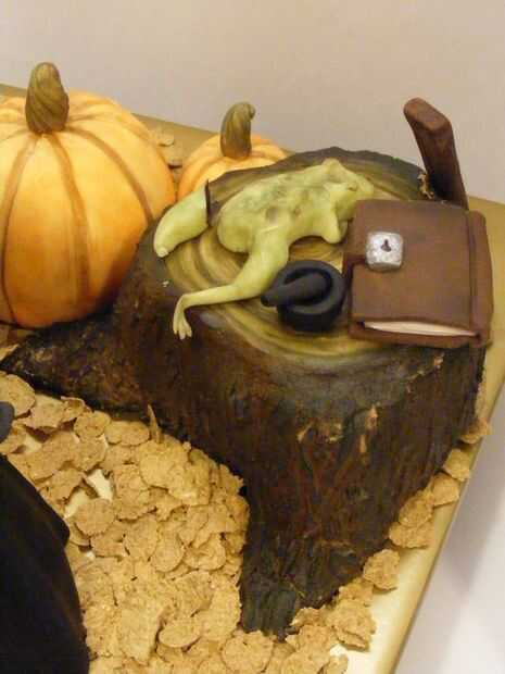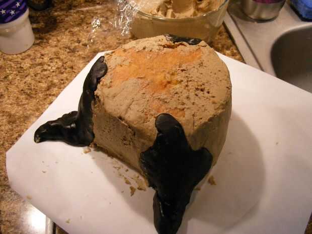 Después de nivelar ambas capas de la torta, puse en el tablero de la torta y tallados en algunas formas de "v" entre cada raíz. (un árbol real no es perfectamente redondo, derecha?) Usé crema de mantequilla de arce glaseado para el relleno y luego poner una capa fina (1/4"), excepto en la parte superior. A continuación, añadí enrollados piezas de fondant negro para crear las raíces del árbol. (el fondant se quedó de la caldera y la bruja)
