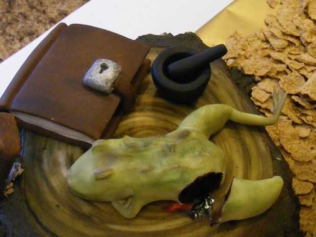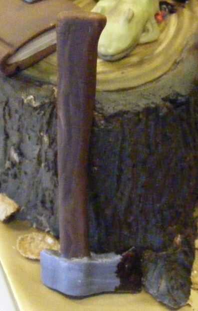 Para colmo, he añadido los papás... la rana (su pierna corte jejeje) libro, mortero y Maja y sólo se inclinó el hacha al lado del árbol.