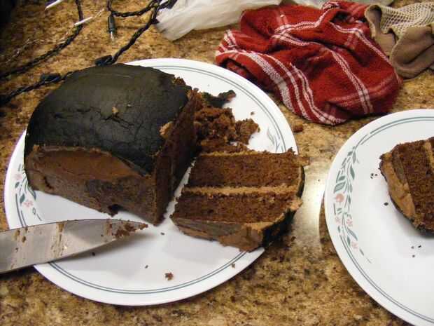 Después de yo sólo básicamente coloca las placas en ambos lados y corte el pastel por la mitad a cada lado de la tubería. Cayó de una pieza más y una poco de la torta pegada en el tablero de la torta inferior, pero en realidad, no hay gran cosa. Luego yo solo en rodajas cada mitad en servir porciones de tamaño.
