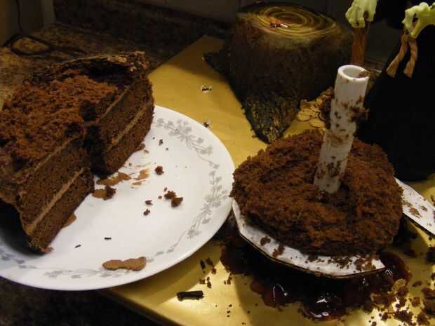 Cada vez que diseño un pastel, generalmente pienso en la talla y el proceso de servir así. Es sólo una cuestión de seguir los pasos de construcción hacia atrás. El tocón del árbol es bastante autoexplicativo, simplemente cortar y tallar como lo haría cualquier otro pastel redondo.