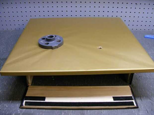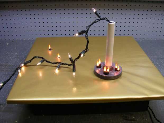 A continuación, perfora el papel donde los agujeros para la base del caldero y atornillan en la placa base. He medido y utiliza la sierra para cortar ingletes para cortar el tubo de PVC para la torta a cerca de 5 1/2 pulgadas. Alimenté el extremo de la hebra luz (que sería el goo verde en el caldero) para arriba por el tubo de debajo. Mi cadena luz tenía un enchufe en un extremo y un recipiente en el otro. Por lo tanto, me corte el extremo del receptáculo y grabados individualmente los cables con cinta aislante. Por supuesto, idealmente, se desea utilizar un filamento que terminó con una luz y no un receptáculo. Me acaba de pasar a usar lo que tenía en mano.