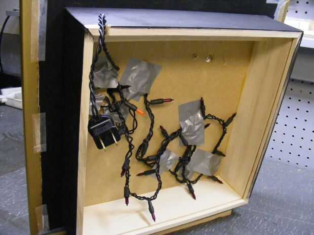 Ahora dar su iluminación de una prueba de funcionamiento para asegurarse que todo está funcionando. Además, en la foto muestro la secuencia ligera colgando hacia fuera, pero antes del montaje de la tarta real, empujé los cables por el tubo para que cuando puso el pastel, lo quisiera tocar los cables y se protegerían.