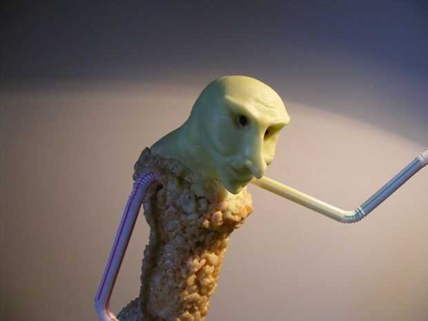 Luego, comencé a cubrir sus brazos con el fondant verde. Como se puede ver en una de las fotos, he quitado la mano"pellizco" y atrapado en un bloque de espuma de poliestireno para secar para que los dedos mantenga su forma. También, fondant es bastante pesado, de hecho, cuando fui a conectar ese brazo, terminé insertando un alambre a través de la pajita para mayor apoyo... PLUS... Hizo una pequeña muleta temporal a ella son del agujero para arriba mientras lo secas.