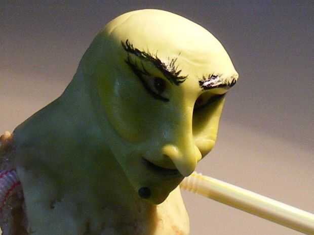 ¿Una vez que estaba satisfecho con la forma de la cara, he usado gel alimento para colorear a mano pintura sus cejas, le dio algún delineador de ojos, y lo que es una bruja sin la mole negro? Así que había pegado en una bolita de fondant y había pintado que el negro también. Luego usé un polvo de colorante de alimentos verde musgo (también conocido como "polvo de pétalo") para el sombreado y un amarillo brillante para sus huesos de la mejilla.