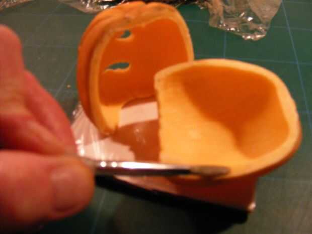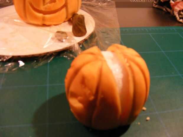 Trabajando en una calabaza a la vez, había espolvoreada la bola con fécula de maíz en primer lugar. (esto hará que para facilitar la extracción posterior. Luego cubre la bola con el fondant y recortado en la parte inferior. Recogí la bola y metido en la pasta de azúcar por debajo, esto ayudó a darle la calabaza un fondo abierto, pero más duradero.
