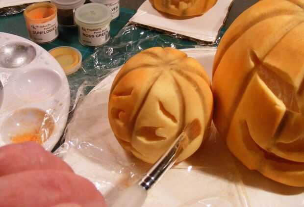 OK, entonces deje secar durante la noche en las bolas de espuma de poliestireno frente a un ventilador. Al día siguiente, rozó en algunos más colorante en polvo naranja. (Creo que usé "girasol") También usé un color cacao para profundizar en las líneas y luego un verde musgo y cacao al color de los tallos.