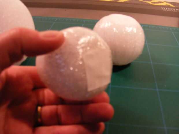 Empecé por tomar bolas de espuma de poliestireno y de corte las bases planas, para que las calabazas se sentarían erguido y todavía. Luego usé mi dedo pulgar para hacer una impresión en la parte superior que serviría como un nitch de los tallos para sentarse más adelante. Me envuelven las bolas firmemente en plástico y poner un trozo pequeño de cinta adhesiva en la parte inferior.