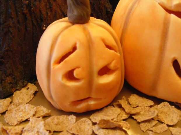 A continuación, usé una herramienta de fondant para hacer las depresiones para las líneas de la calabaza. Quiere ir lo suficientemente profundo para darle dimensión, pero al mismo tiempo, no va demasiado fina. Una vez que las líneas, llegó el momento de tallar mis calabazas! Usé un cuchillo del exacto y tallado de las caras. Para los tallos, yo sólo utiliza desechos había rodado en troncos pequeños y les torció ligeramente para esa mirada de vástago realista.