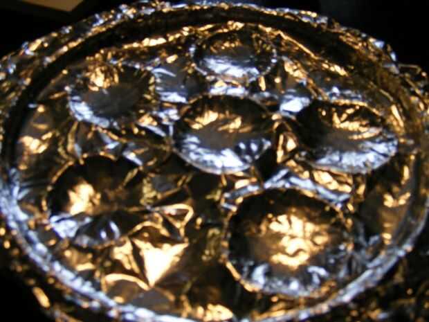 Encontrar una receta de caramelo fue fácil (hay muchas en la red), pero tenía que averiguar cómo molde o forma. Para el goo verde, he utilizado una tapa de vidrio plano de sobre de mi vidrio tazones de fuente de Pyrex. Luego cortar pedazos de un cartón de huevo cartón y les recortan todos inferior a la tapa entonces sólo grabadas en los fondos para no moverse. A continuación, utilizar papel de aluminio de alta resistencia para cubrir todo y había hecho depresiones en la lámina. No quería que esta demasiado espeso así que mantuve las depresiones poco profundas. Creo que terminó siendo tal vez 1/4"-1/2" de grosor. Pero ten cuidado, demasiado fino y se romperá durante el montaje, muy gruesa y va a ser demasiado pesada. (mi pieza era bastante pesado como era) Después de que usted está satisfecho con el molde, rociar ligeramente con un spray de cocina antiadherente.