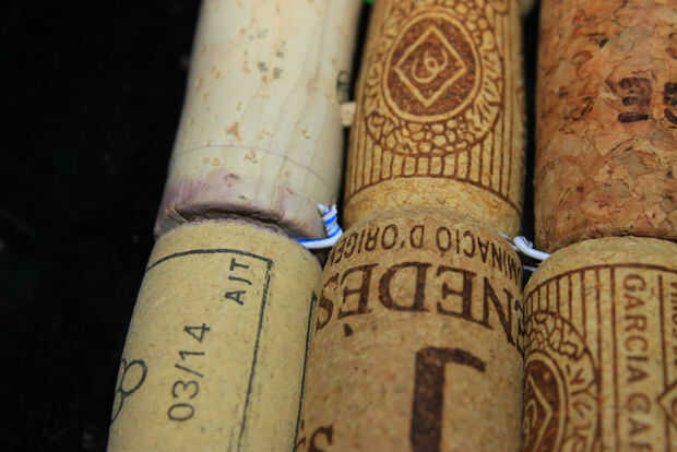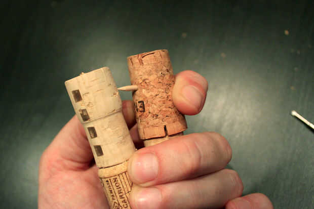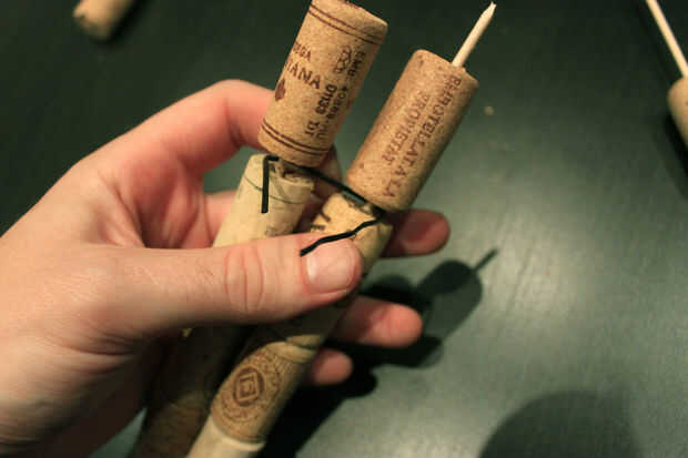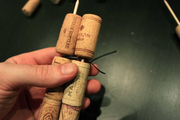 Una vez que tengas ambos palillos al lado de uno es hora de usar el cable y poner dentro los huecos de los cierres de corcho.