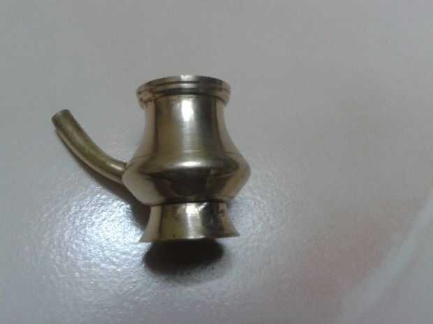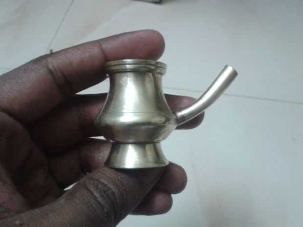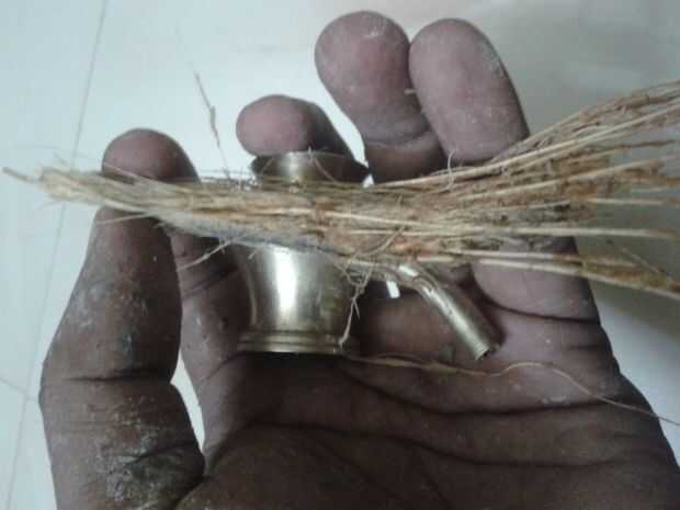 3) completamente mojado el material de cobre amarillo quiere limpiar y rociar agua sobre la cáscara del coco con zumo de limón y Tamarindo frutos.