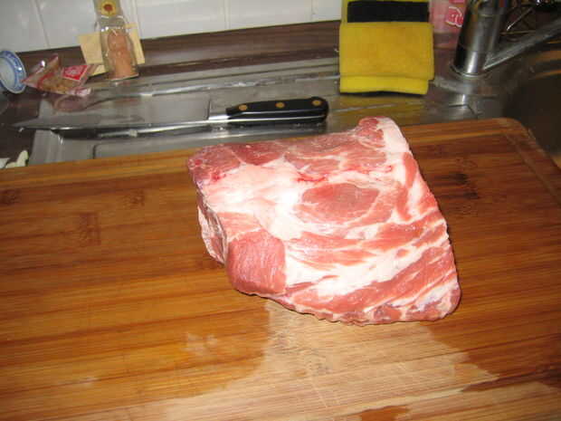 Puede tener una diferente forma de cerdo mientras se cocina esta. Debido a la falta de la carne de cerdo que quería usar, decidí usar este cerdo. Cortar trozos más pequeños hará más fácil para que prepara para la estufa. Si usted ya tiene rodajas finas, o tiene trozos relativamente pequeños, no tendrá que cortar. De lo contrario si tienes mala suerte como yo, usted cortará la carne. Después de cortar la carne, debe dejarlo en la tabla de cortar.