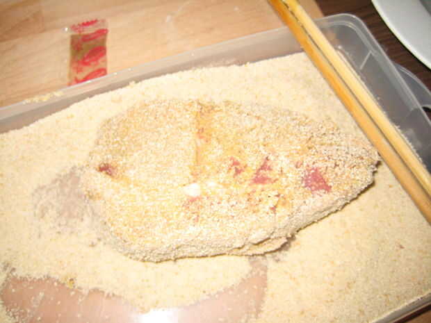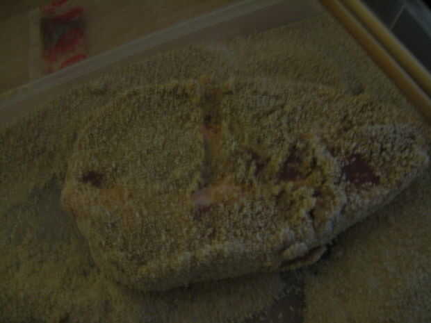 Una vez que los pasos finales, usted debe colocar al lado de uno. Al final de las estaciones debe proporcionar una placa grande donde se colocará toda la carne en. Primero se coloque la carne en la harina y asegúrese de que está completamente cubierto. A continuación debe encestar en los huevos, y finalmente debe colocar en el pan rallado. Después de usted ha colocado en las migas de pan, puede proba y cubre lo más posible con el pan rallado. Se pegarán en la carne gracias a la harina y los huevos. Cuando haya terminado de cubrir con las migas de pan se coloca sobre la placa y luego continuar con el resto de la carne. Si tienes huevos de sobras, puede tomar una de las carnes preparadas y dunk en los huevos y luego el pan rallado. De esta forma que tienes que no perder los huevos.