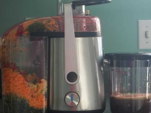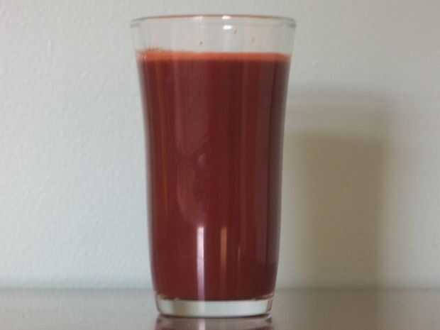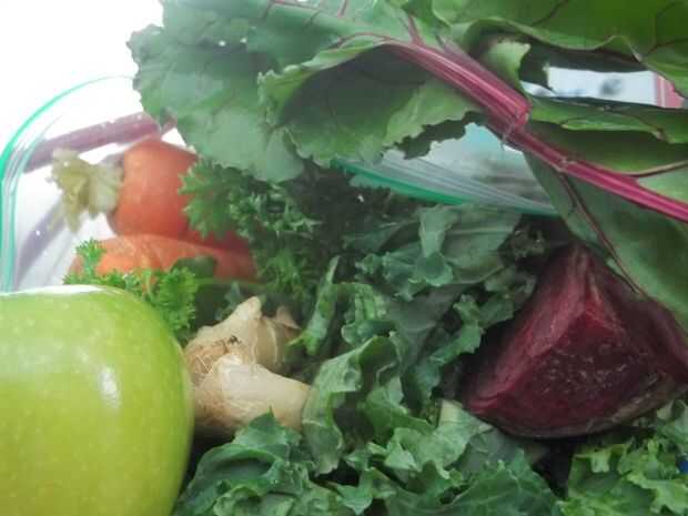 En un exprimidor de extracto: 3-4 tazas de col rizada, perejil 1 taza, trozo de tamaño 1 pulgar de jengibre, 1/4 sección de una raíz de remolacha grande con verdes de una remolacha, manzana verde pequeña 1 y 2 zanahorias grandes.